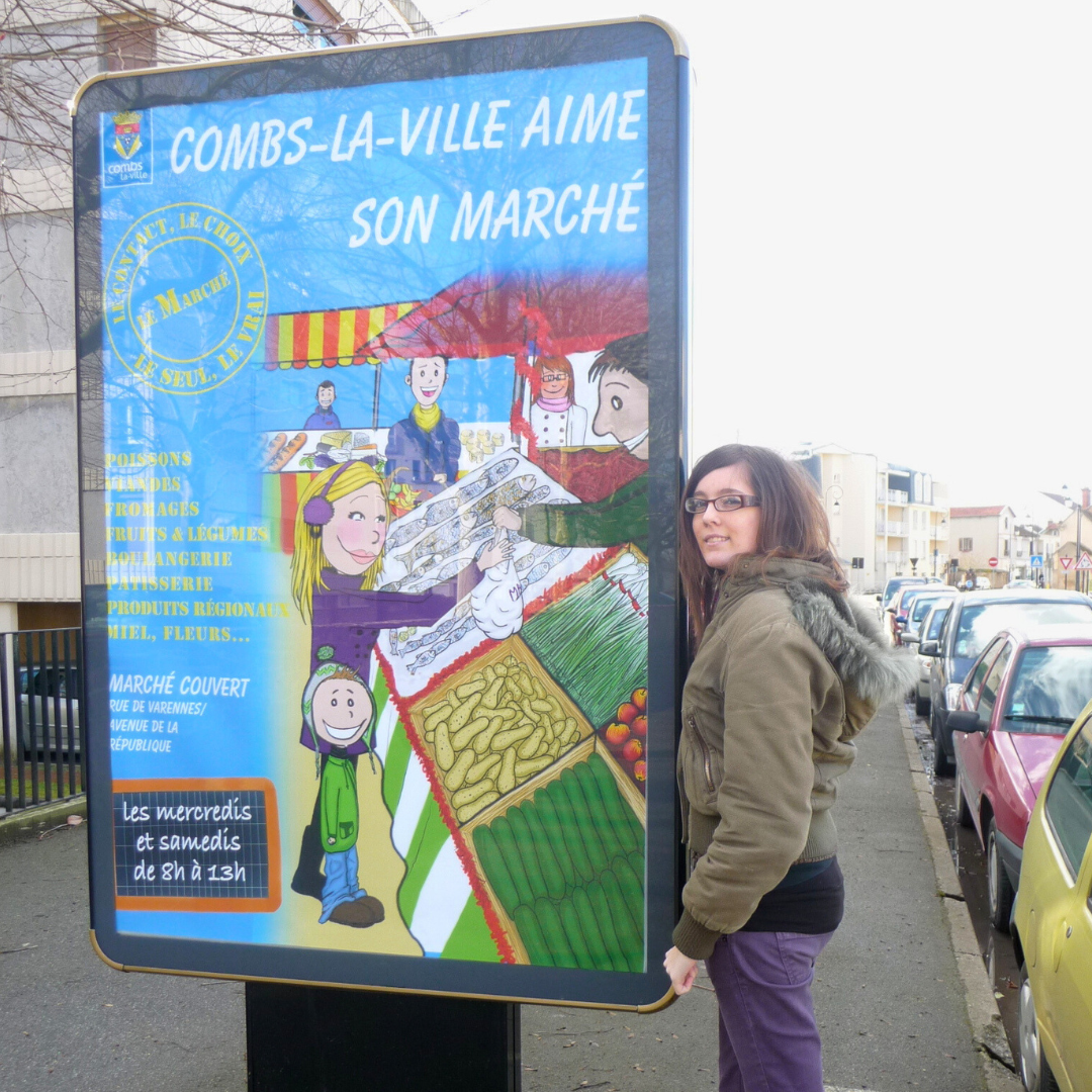 En janvier 2010, j'ai fait un stage à la mairie de Combs-la-Ville, France pour découvrir l'infographie. On a fait une affiche "Combs-la-Ville aime son marché". J'ai dessiné avec la tablette Wacom, les autres ont mis les mots et le titre. C'était une expérience agréable de découvrir cela avec eux.